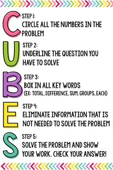 You may have seen anchor charts in elementary school classrooms and colorful posters on Pinterest and Teachers Pay Teachers for this ineffective strategy. There is no research to back this one up, it’s just a fun acronym someone came up with and it caught on. Part of the problem with this is that it relies on the keyword strategy that we already debunked. Here ‘B’ stands for Box keywords. Robert Kaplinsky has a great blog post that addresses some of the concerns behind CUBES - Is Problem Solving Complex or Complicated? This post also offers up a replacement strategy - the Problem Solving Framework.